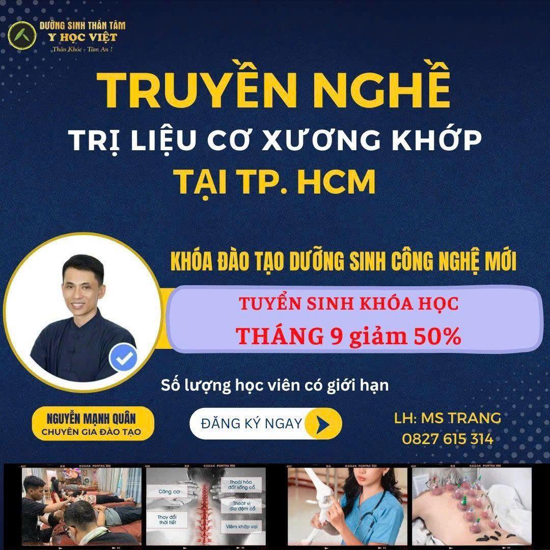 Dưỡng Sinh Đông Y Mạnh Quân thông báo khai giảng Khóa học Truyền nghề Dưỡng Sinh Trị Liệu Cơ Xương Khớp – chương trình đào tạo chuyên sâu dành cho những ai mong muốn nâng cao tay nghề trị liệu, hiểu sâu về cấu trúc cơ thể và ứng dụng tri thức Đông – Tây y trong thực hành.